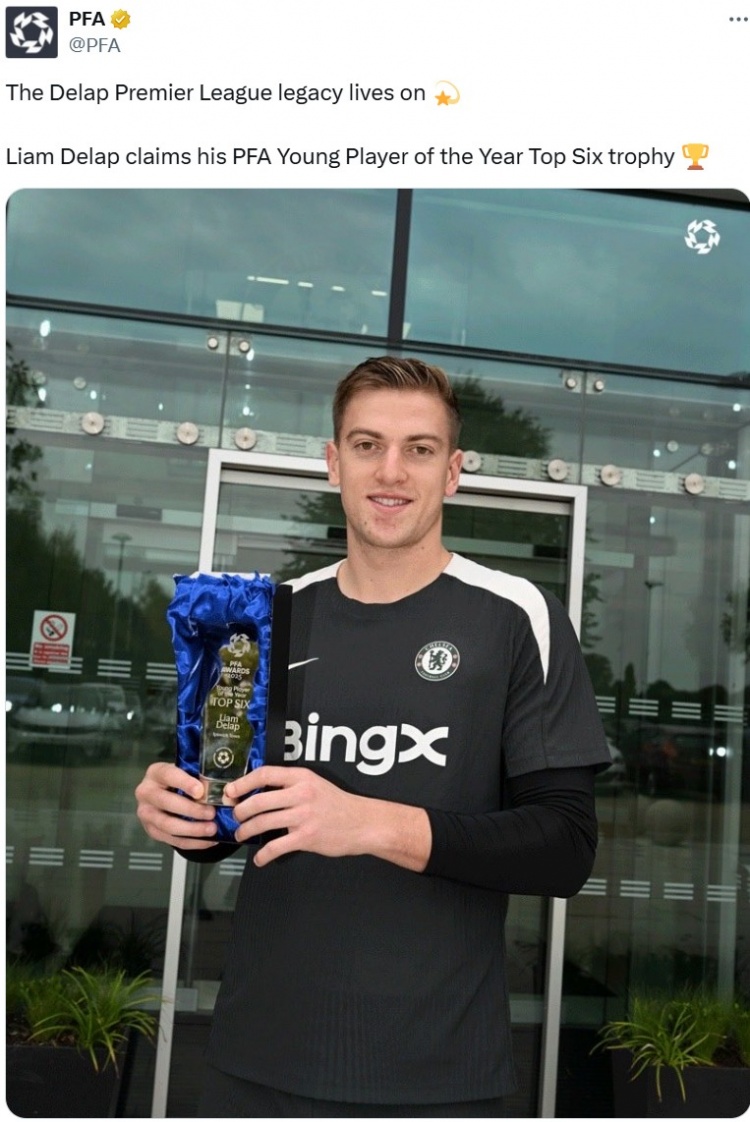 2025-10-08 00:01:33德拉普荣膺PFA年度最佳年轻球员前6,PFA官方晒球员领取奖杯照片