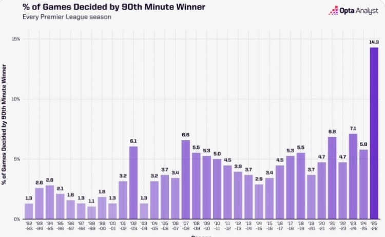 2025-10-08 00:01:48本赛季英超90分钟后打进制胜球比赛占比14.3%,远超此前所有赛季
