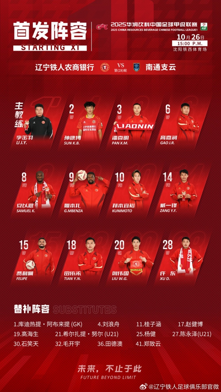 10月26日讯 在中甲联赛第28轮中,辽宁铁人将在主场迎战南通支云。比赛开始前,双方公布了出场名单。