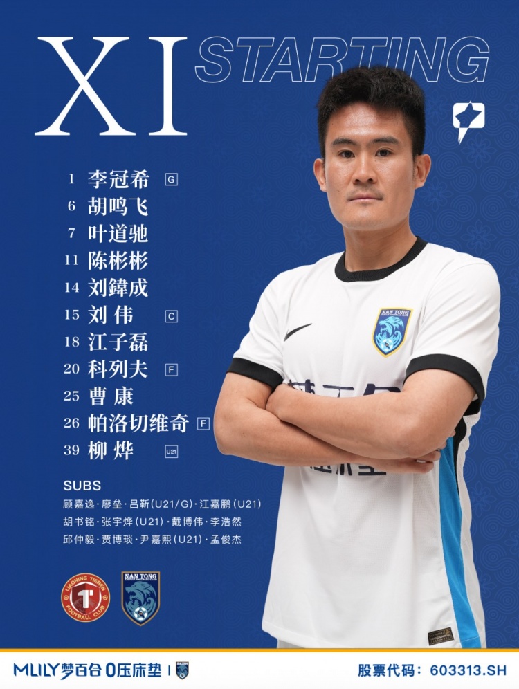 南通支云首发:1-李冠希、7-叶道驰、6-胡鸣飞、15-刘伟、18-江子磊、25-曹康、26-帕罗切维奇、14-刘鍏成、11-陈彬彬、20-科列夫、39-柳烨(U21)