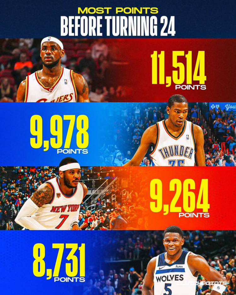 球星24岁前得分榜:华子8731登第4 詹姆斯断档第1 KD甜瓜分列2、3