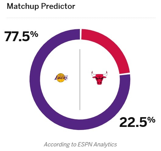 今天,ESPN预测本场比赛胜率,湖人77.5%,公牛22.5%。
