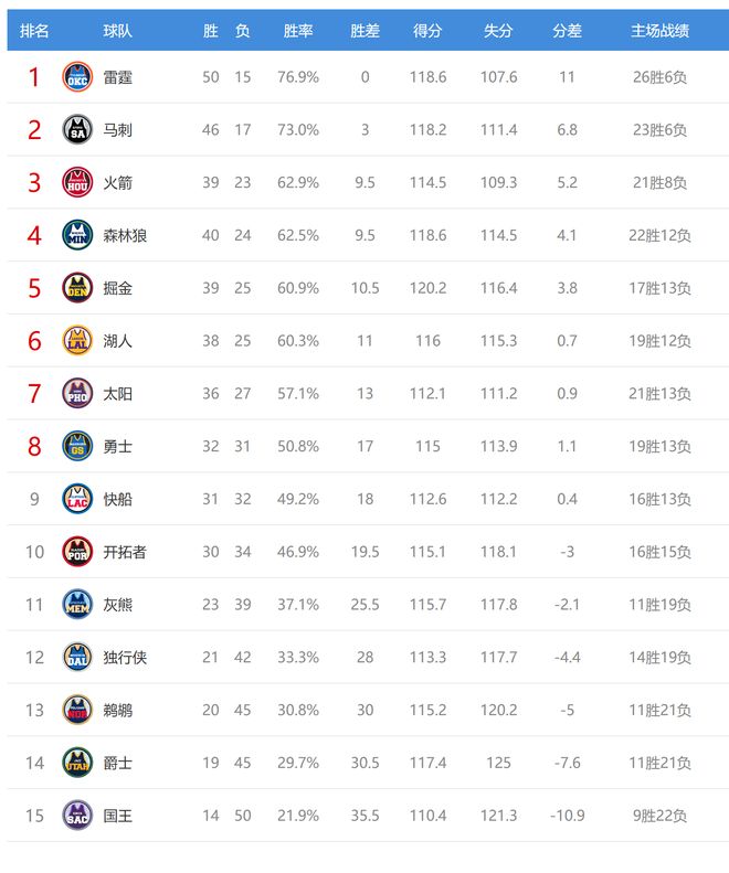 今日比赛后火箭、森林狼排名互换,其他西部球队排名不变。