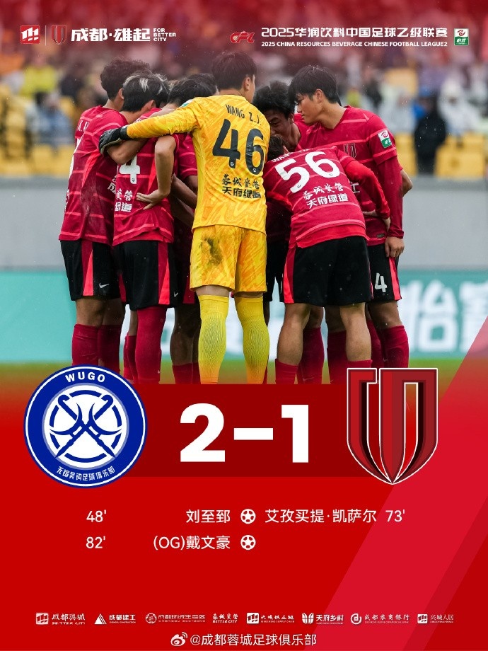 今日,2025华润饮料中乙联赛第29轮(决赛阶段第7轮),成都蓉城B队客场挑战无锡吴钩。上半场,成都蓉城B队主打防守反击,但未能创造出好的破门机会,半场比分定格为0-0。下半场第48分钟,对手抓住机会先进一球。随后成都蓉城B队展开反击,第73分钟,艾孜买提·凯萨尔在周耘屹助攻下,30米开外打入一记世界波,扳平比分。比赛进入尾声阶段,戴文豪在防守解围时不慎将球碰入球门。最终,成都蓉城B队1-2无锡吴钩。