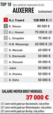 因此,欧塞尔俱乐部(AJA)虽然仅需承担以下租借球员月薪的一半:由伯恩茅斯租借的科特迪瓦进攻中场哈梅德·朱尼尔·特拉奥雷(25岁,欧赛尔承担24万欧元中的12万)、由狼队租借的荷兰右后卫基-加纳·霍福尔(23岁,欧赛尔承担15万欧元中的7.5万),以及由伯恩利租借的中场汉-诺阿·马森戈(23岁,欧赛尔承担12万欧元中的6万),马森戈是合同中唯一包含买断选项的球员,这个价格也使得这三位球员分别位列俱乐部薪资榜的第一、第三和第五位。